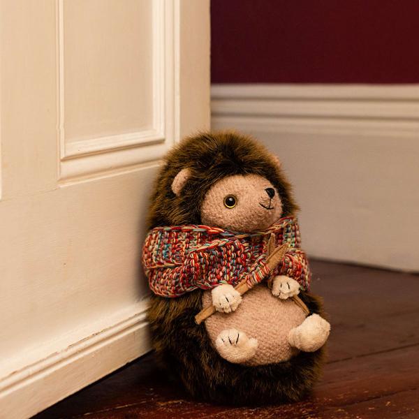 Mon Entrée Design vous présente ici Hester Hedgie, un cale porte animal original en forme de hérisson en train de tricoter sa propre écharpe.