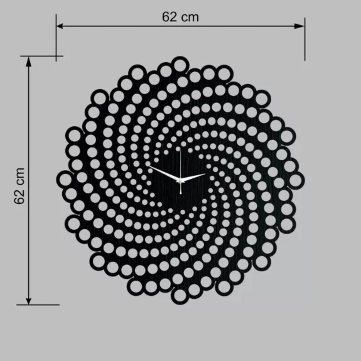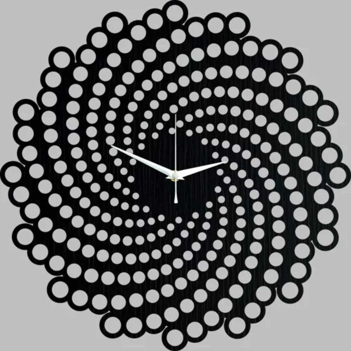 Horloge Originale en forme de spirale noire ,Silencieuse en bois à aiguilles Blanches, dimension 43 x 43 cm.