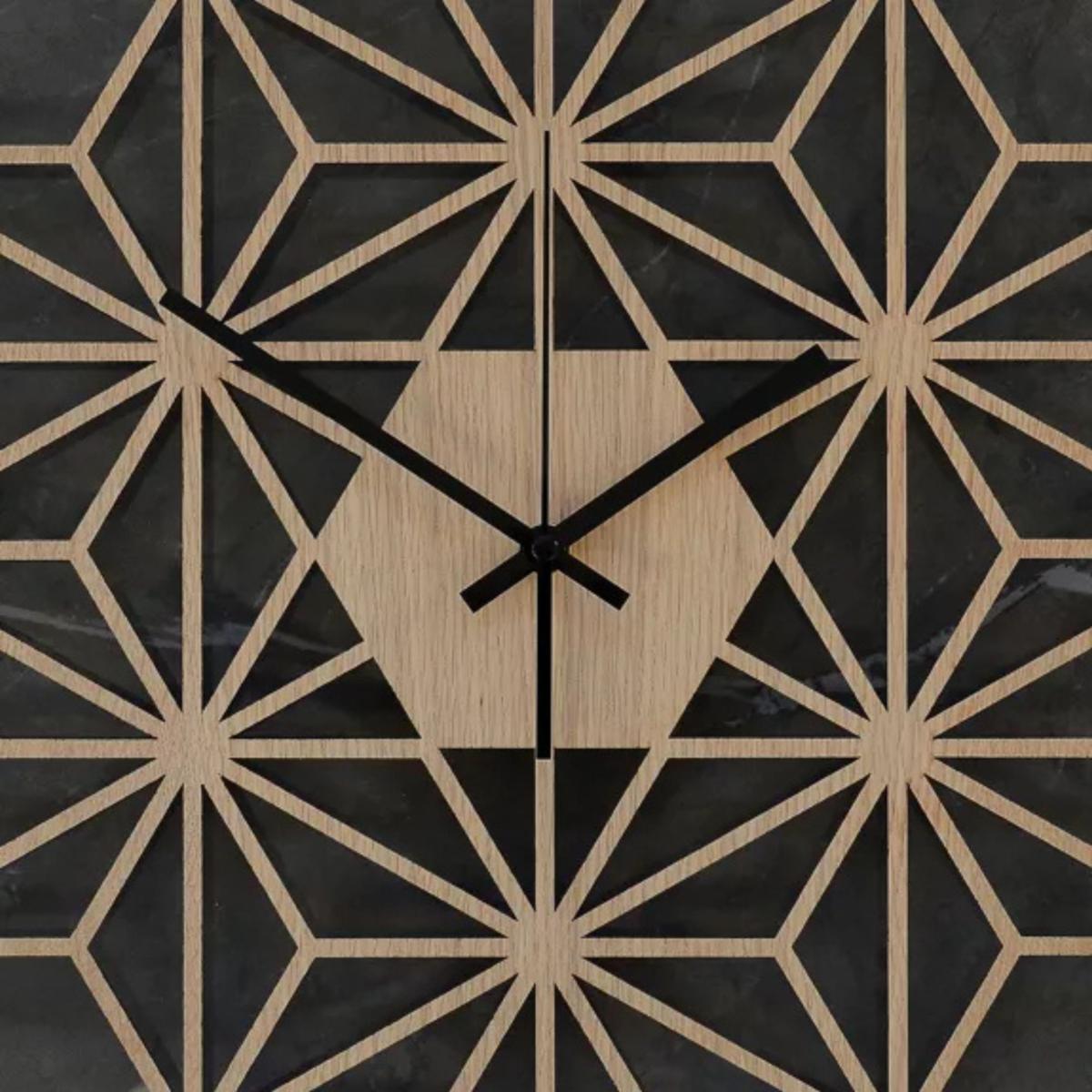 Horloge Originale en forme de flocon de neige ,Silencieuse en bois coloris Chêne naturel, à aiguilles noires, dimension 43 x 43 cm.