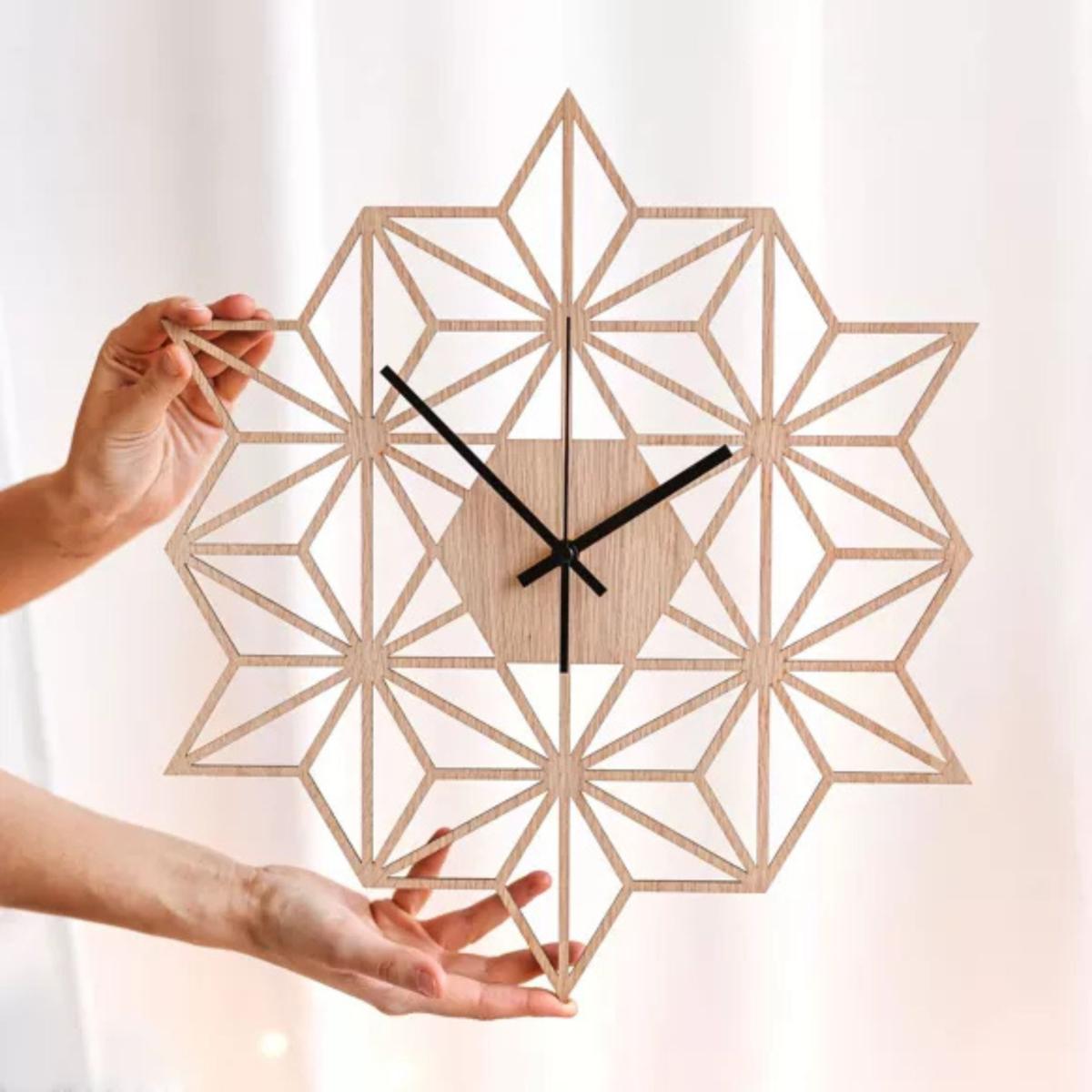 Horloge murale en bois design "Flocon de Neige" – Pureté naturelle et élégance artisanale