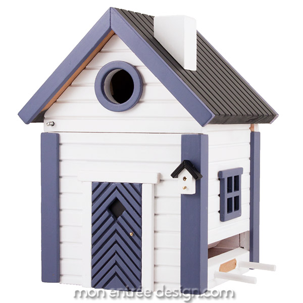 L'originalité de ce nichoir en bois peint, principalement en blanc et bleu, inspiré des habitations traditionnelles scandinaves, réside bien entendu dans son apparence mais également dans sa capacité à se transformer en mangeoire pour oiseaux une fois l'hiver venu. Pour ce faire, il suffit de bloquer l'accès au nid grâce à un petit taquet placé au niveau de l'œil de bœuf.