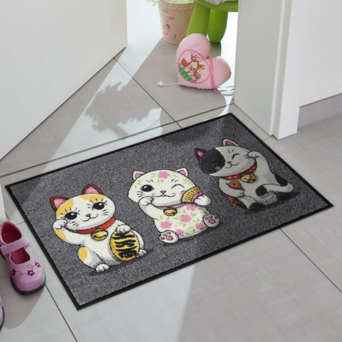 Tapis d'entrée design avec 3 Chats chanceux , Lucky cats ,façon " Maneki-neko" Japonais sur fond gris, 50x75cm.